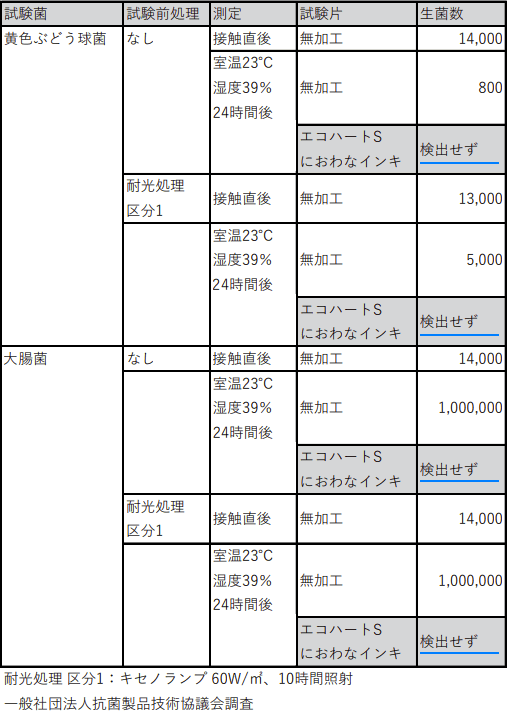 ①黄色ぶどう球菌 試験直後に約13,000~14,000個だった菌が、 24時間後に無加工でも800~5,000個まで減菌しておりますが、 におわなインキでは検出できない状態まで減菌されております。