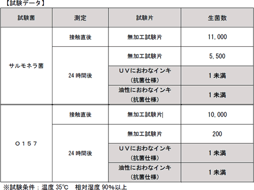 ②O157 試験直後に約10,000個だった菌が、24時間後に無加工試験片でも約200個に減少しましたが、におわなインキ(抗菌仕様)では1未満まで減少しました。
